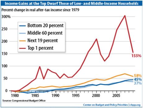 Let’s look at some recently published statistics that highlight the extent of inequality in the Mecca of global Capitalism – the United States. A 2012 US census bureau population report places the average income of the top 2% of American households in 2011 at US $ 0.42 million which is approximately 30 times that of the bottom 30%.In fact, on a purchasing power parity basis, the average household income at the bottom 15% of the US pyramid is lower than the per capita income of Namibia, Algeria or Guyana! An analysis of growth in real post tax income over the last 3 decades since 1979, indicates that at the peak of the financial boom in 2007 (just before the markets collapsed), the top 1% of households in America had grown their incomes 300% while the bottom 20% could only manage a tenth of that growth (see figure: Source – Centre on Budget and Policy Priorities) – possibly underlining the ‘rent-seeking’ behaviour of those with influence. What else could likely explain prolonged periods of favourable tax rates for high income groups and a comfortably high exemption limit estate tax structure that effectively only taxes super-rich couples on estate valued over US $ 10 million after their lifetime?