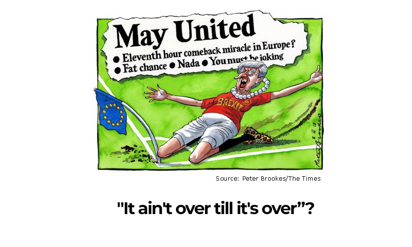 At what seems like a pivotal moment it is important to remember Yogi Berra’s immortal ‘’ it ain’t over till it’s over’ or, indeed, the more ‘cultured’ operatic reference “It ain’t over till the fat lady sings”. Mrs May is the opposite of fat but as the FT’s George Parker wrote today following her latest humiliations: ‘’Is May losing her way to victory?”. Perhaps Peter Brookes may have been premature in his savage satirical comparison  with Manchester United’s improbable win in Paris.
