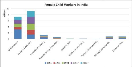 The incidence of child labor is widespread across India. Recent statistics have shown a rise in the number of working children in India. The 1991 national census estimated the number of working children at 11.2 million and the 2001 national census estimated the number of working children at 12.6 million (out of a total of 210 million children aged 5-14 years) of which 6.8 million were boys and the remaining girls. As shown in the graph below, agriculture involves the highest number of children as workers, both male and female(as laborers and cultivators).