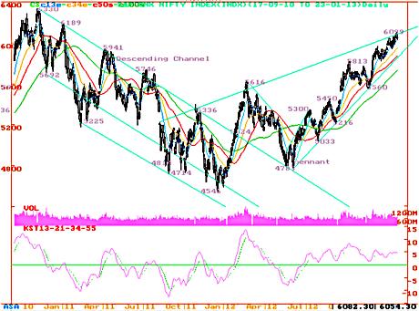 Nifty retested the crucial support at 4783 on the descending trend line. Then nifty never looked back & started an uptrend by making higher highs at 5300, 5450, 5813 now 6099 on 22nd January 2013. The nifty high of 6101-6099 is touching the uptrend line while joining the old higher highs of 5336, 5616.