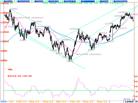 Now within this well modulated Bank Nifty up trend of higher highs 10764, 11748, 12558 & 12900 and higher lows at 9875, 11213, Bank Nifty prices made a recent yearly high of 12900 on 15th January 2013. This was followed by a falling wedge, which initially took support on an uptrend line at 12700 on 25th January 2013, but went till 12960 & then crashed through 12700, 50sma and is now at 12068 on 22nd February 2013 on closing basis.