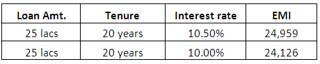 Thus, it can be seen from above that a 50 basis points reduction in interest rate would result in reduction of Rs. 833 in EMI for a loan amount of Rs. 25 lacs.