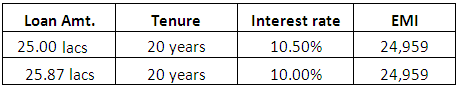 As can be seen from above, the loan eligibility has increased from Rs. 25 lacs to Rs. 25.87 lacs due to reduction interest rate by 50 basis points, the EMI remaining same.